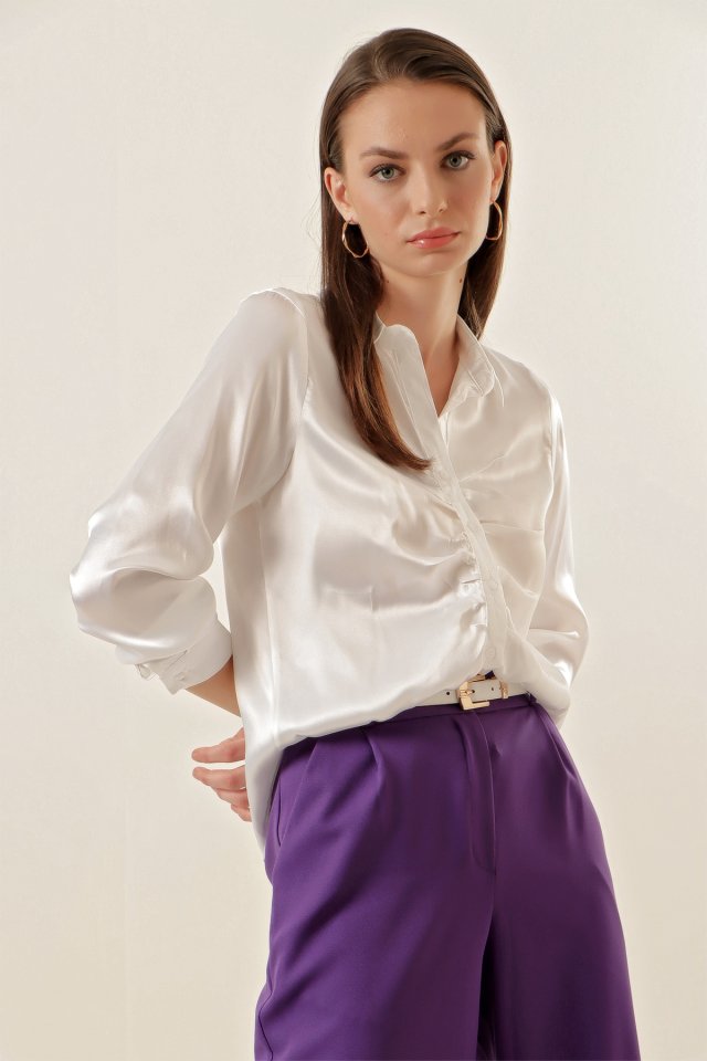 20112 Büzgülü Saten Gömlek - Beyaz
