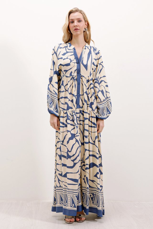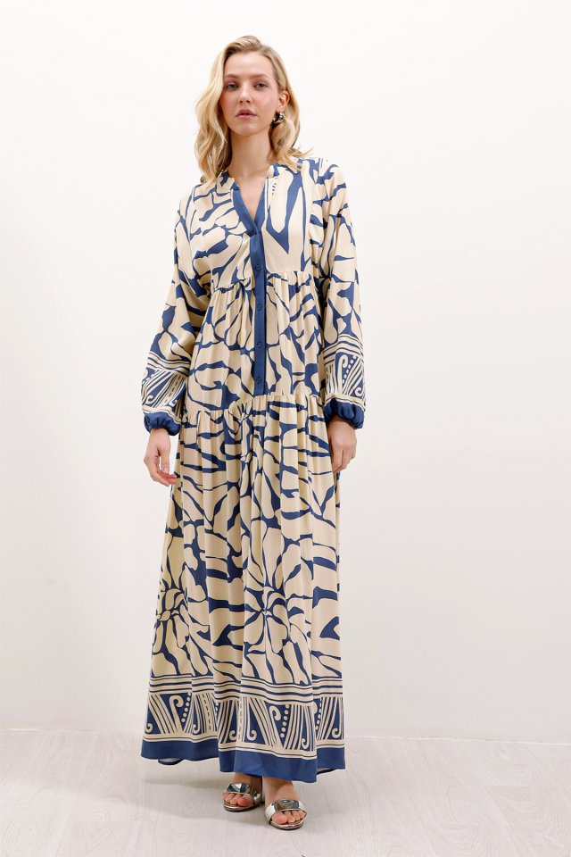 2423 Otantik Desenli Tesettür Elbise - C. İndigo