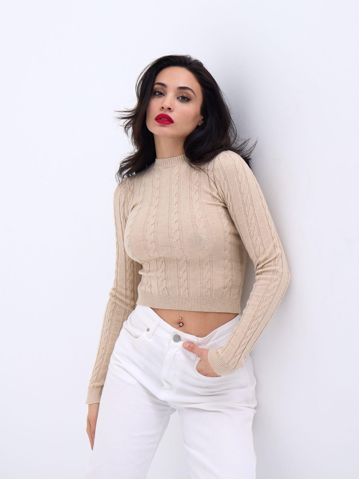 42491 TRİKO SAÇ ÖRGÜ CROP KAZAK-VİZON