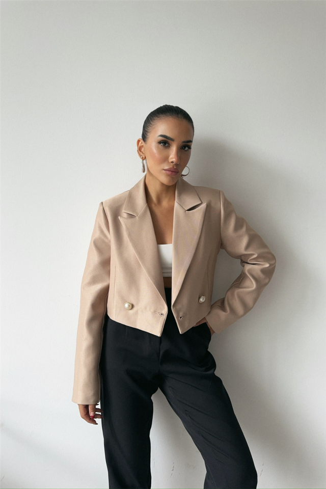 ARKASI İNCİ DÜĞME DETAYLI CROP CEKET - Bej