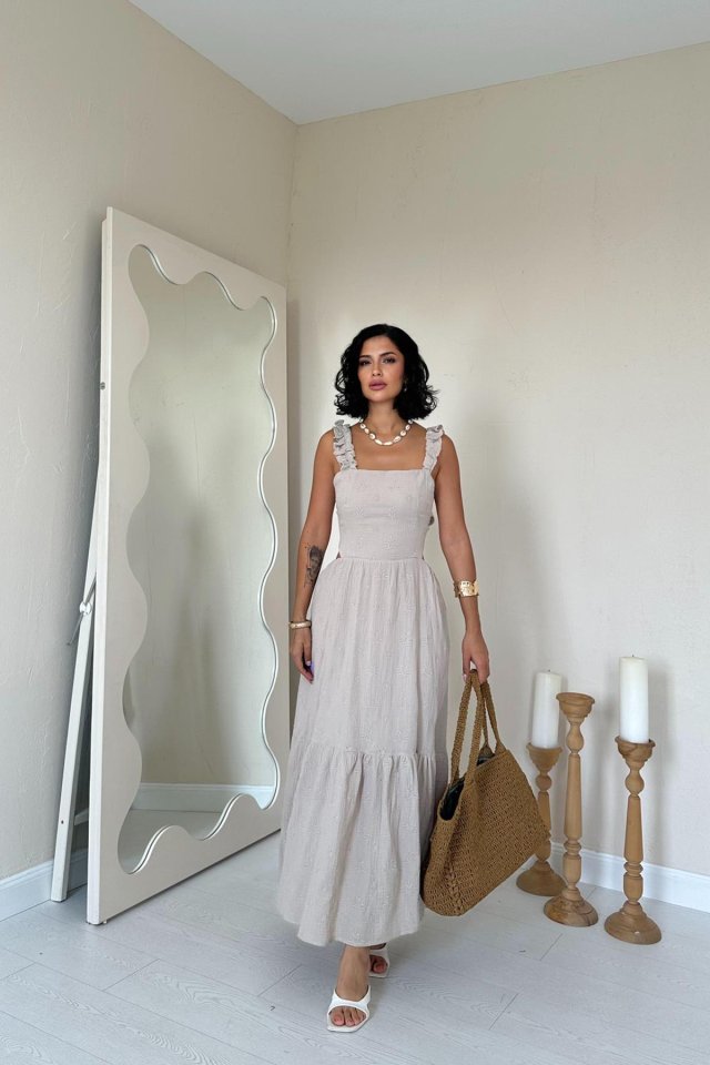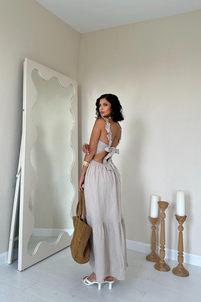 Bej Kolu Fırfırlı Bağlamalı Elbise