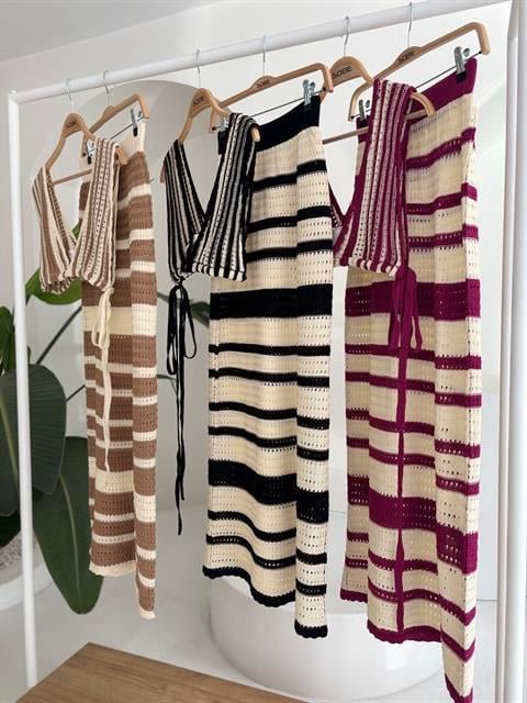Çizgili Bikini Üst Ve Etek Triko Takım 10110