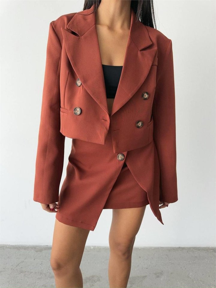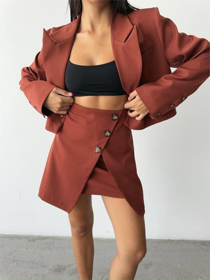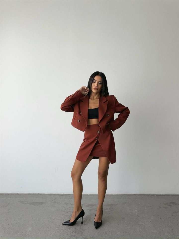 DÜĞME DETAYLI ETEK - CROP CEKET TAKIM - Kiremit