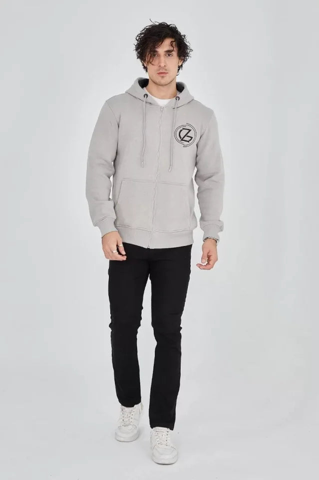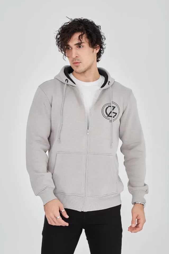 Erkek Kapüşonlu Baskılı Fermuarlı Hırka - Boyalı Gri