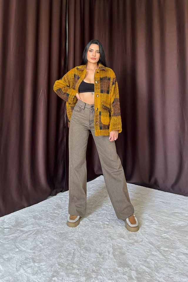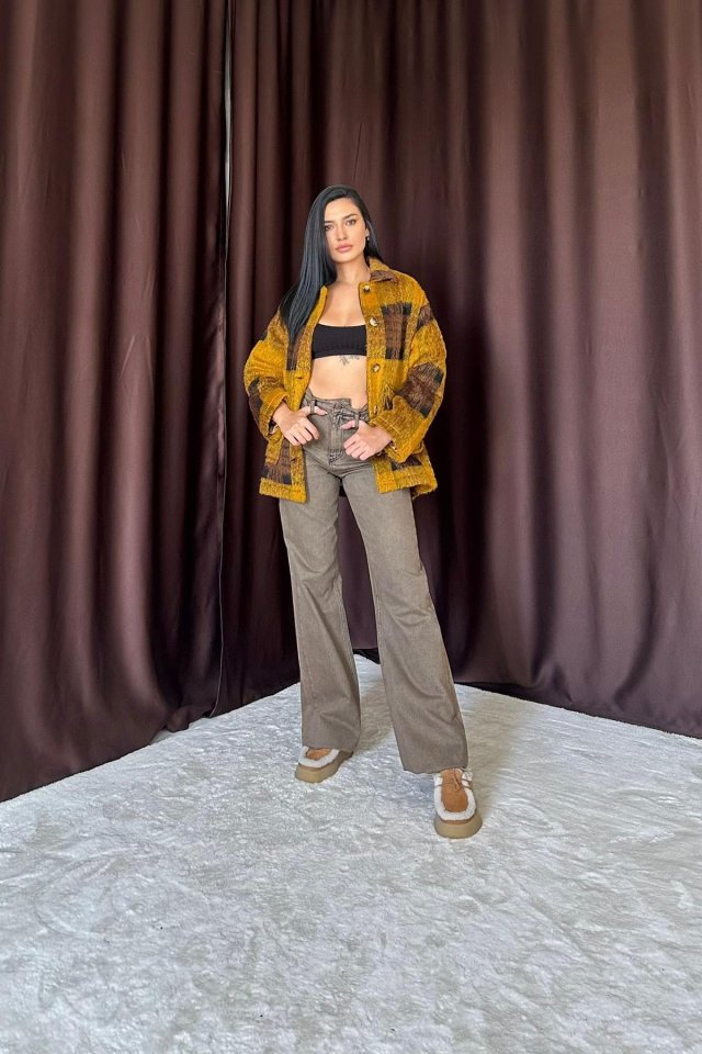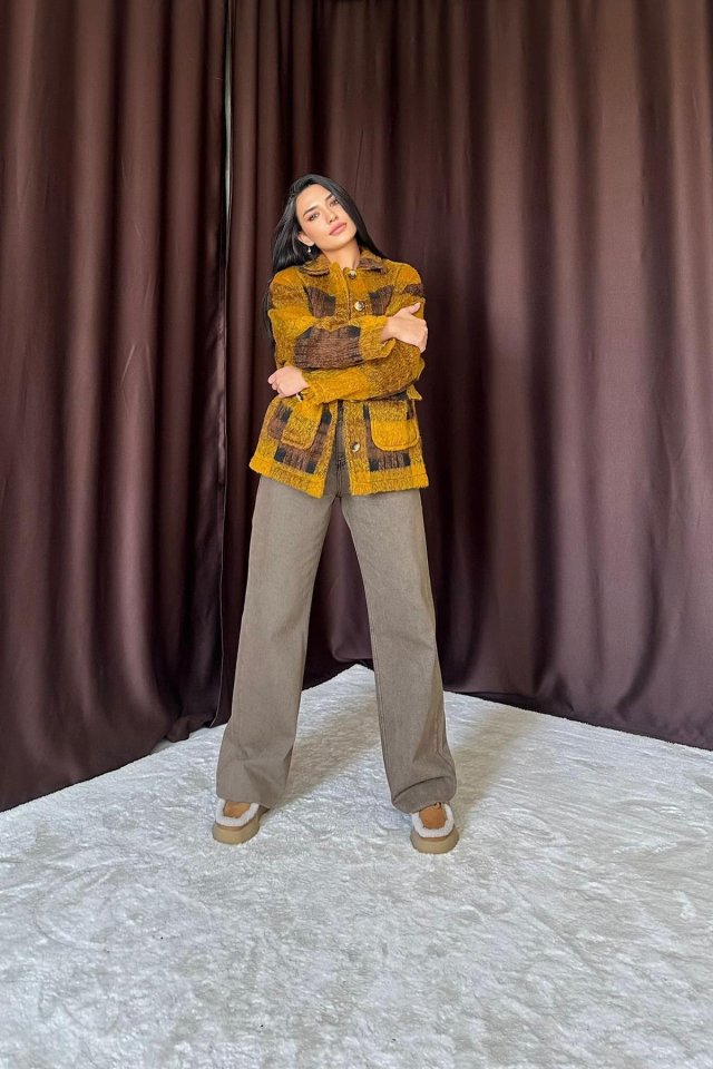 Hardal Siyah Düğmeli Ekoseli Kaban