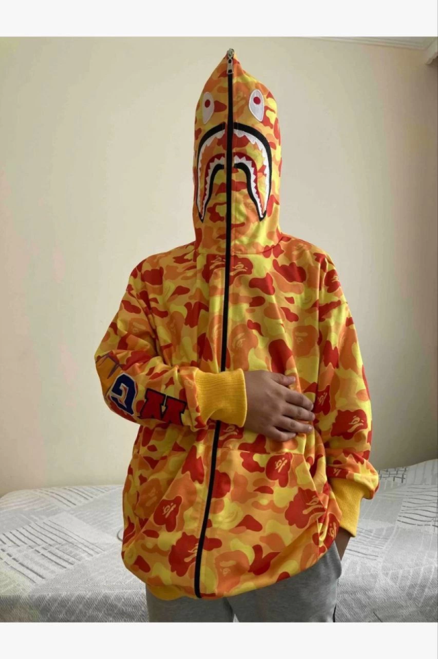 İki İplik Zıp Fermuarlı Nakışlı Kapşonlu Hırka - Sarı