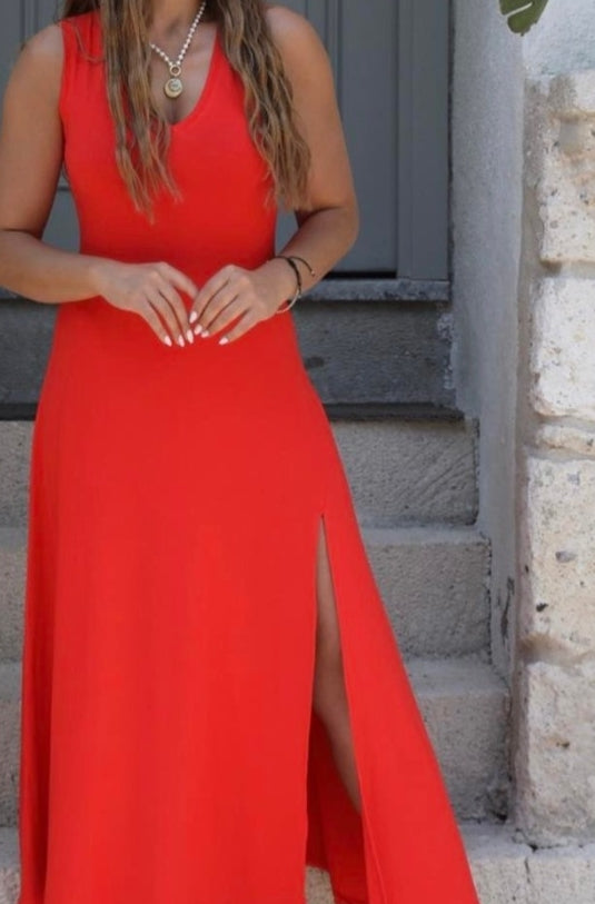 Kadın Askılı V Yakalı Yırtmaçlı Viskon Elbise