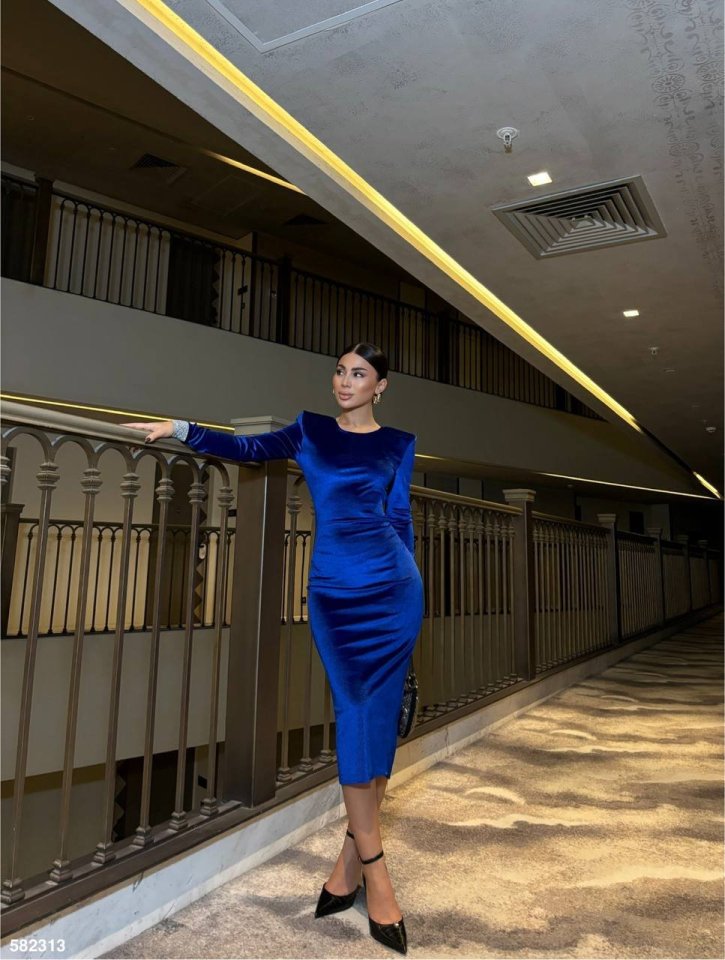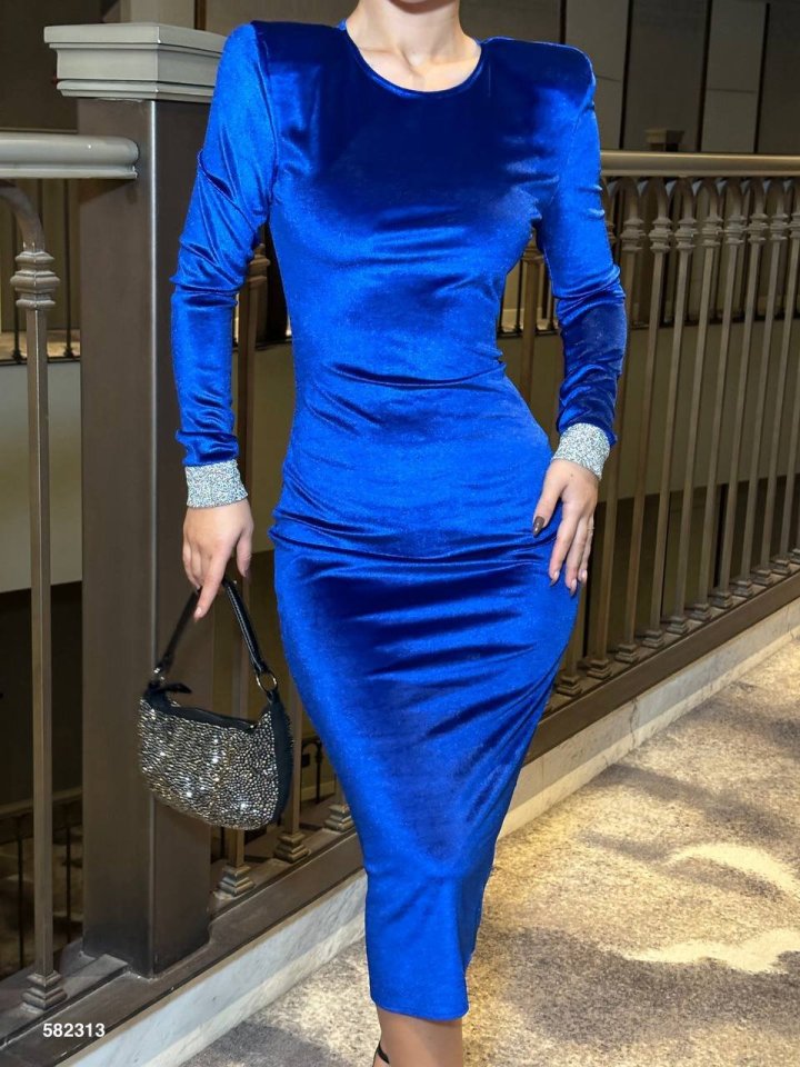 Kadın Bisiklet Yaka Vatkalı Manşet Detay Kadife Kumaş Midi Boy Elbise