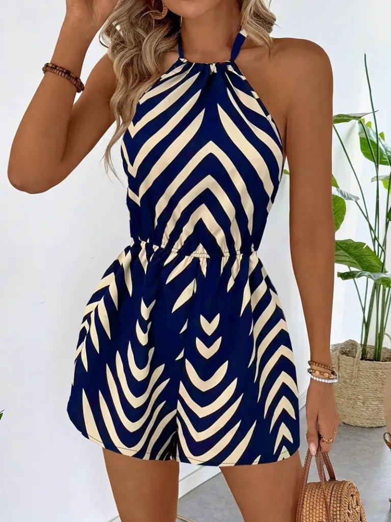 Kadın Boyundan Askılı Halter Yakalı Desenli Süprem Tulum