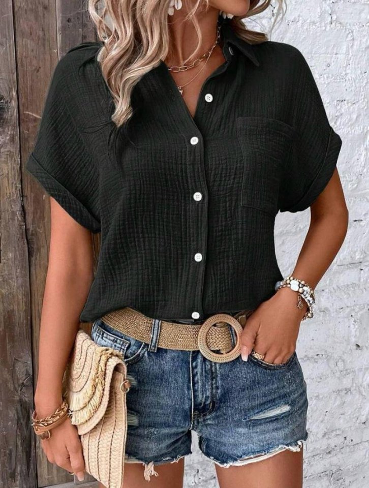 Kadın Cep Detaylı Kısa Kollu Müslin Kumaş Gömlek