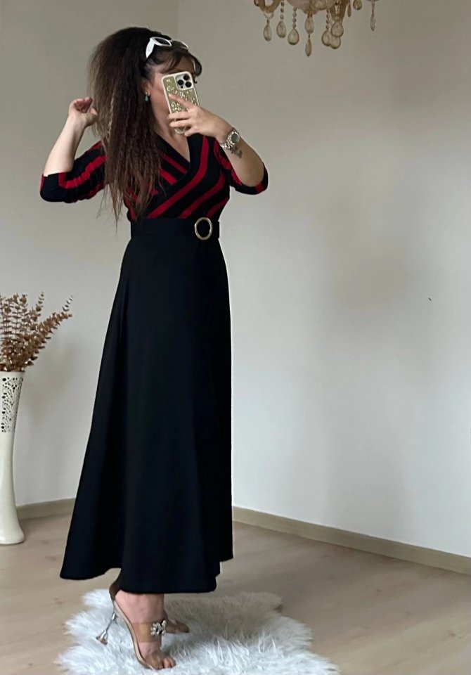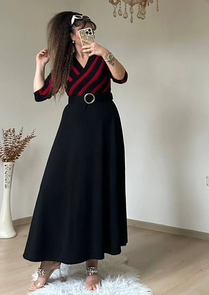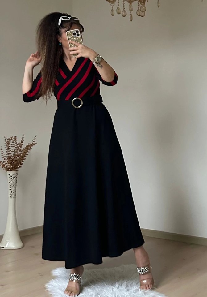 Kadın çizgi Detay Kruvaze Yaka Maxi Boy Triko Elbise