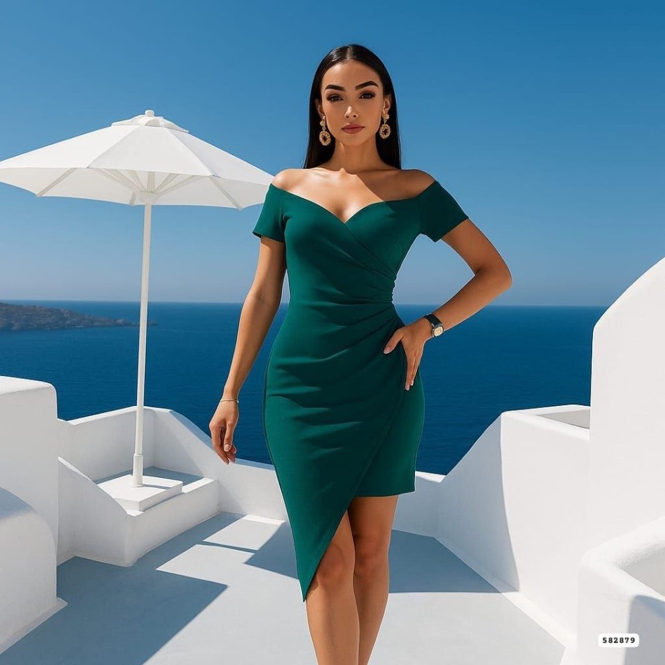 Kadın Dekolte Detay Madonna Yaka Asimetrik Kesim Kruvaze Elbise