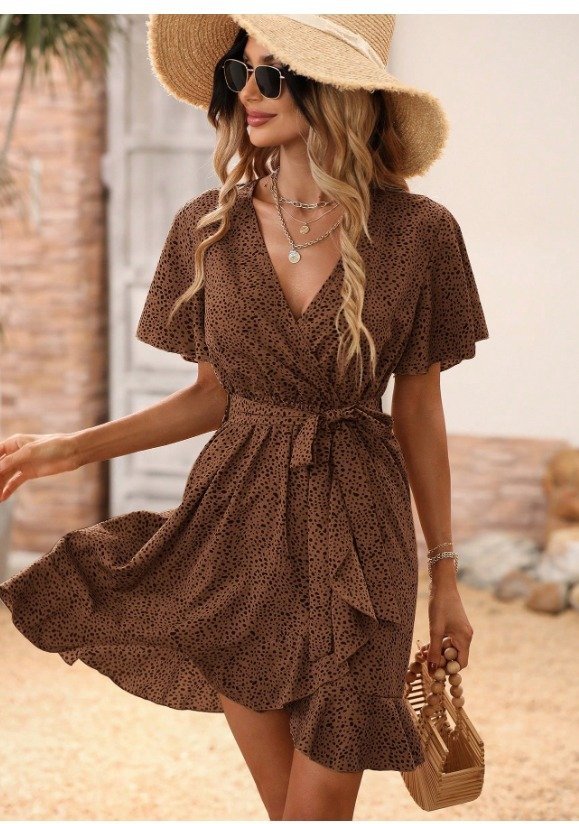 Kadın Kısa Kelebek Kollu Kruvaze Yakalı Belden Kuşaklı Kısa Desenli Süprem Elbise