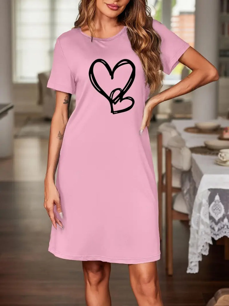 Kadın Kısa Kollu Bisiklet Yaka Kalp Desenli Viskon Elbise