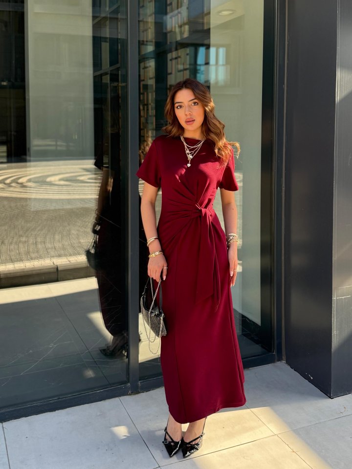 Kadın Kısa Kollu Bisiklet Yaka Yandan Bağlamalı Viskon Iki Iplik Elbise