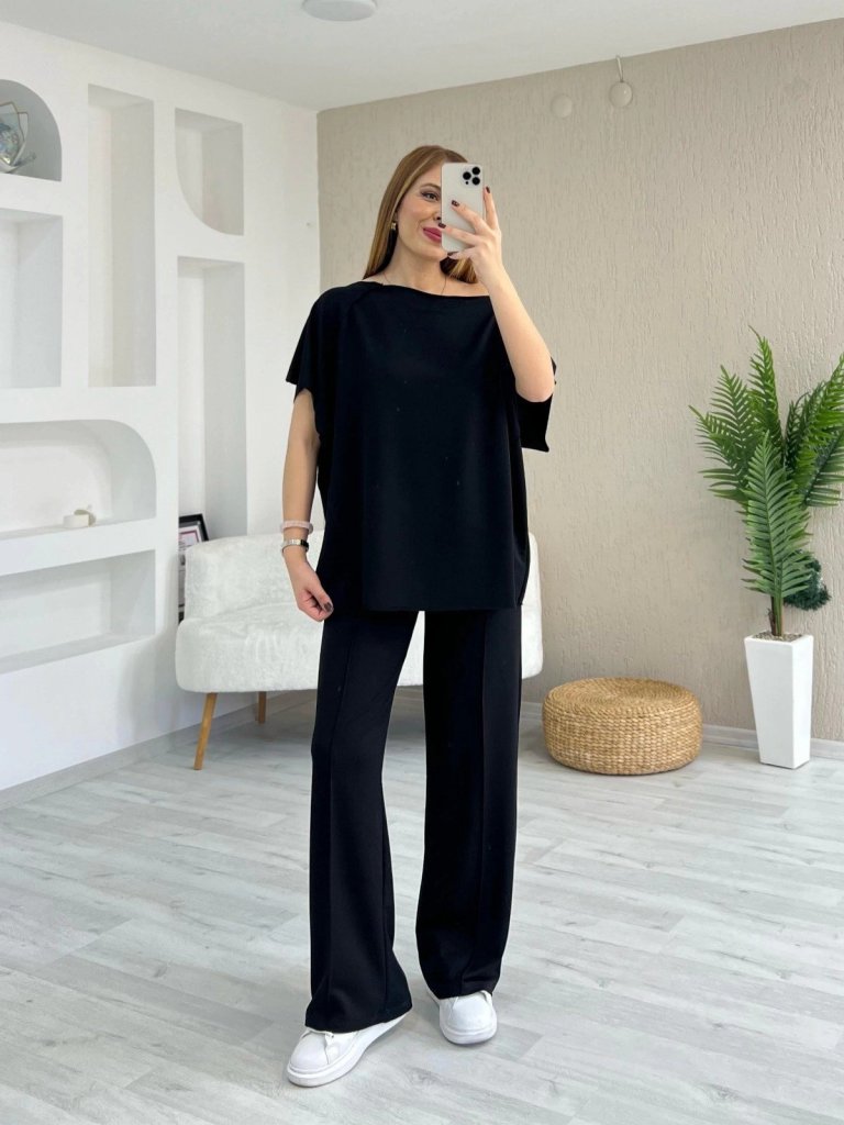 Kadın Kısa Kollu Kayık Yakalı Dikiş Izi Detaylı Viskon Iki Iplik Bluz Ve Pantolon Ikili Takım