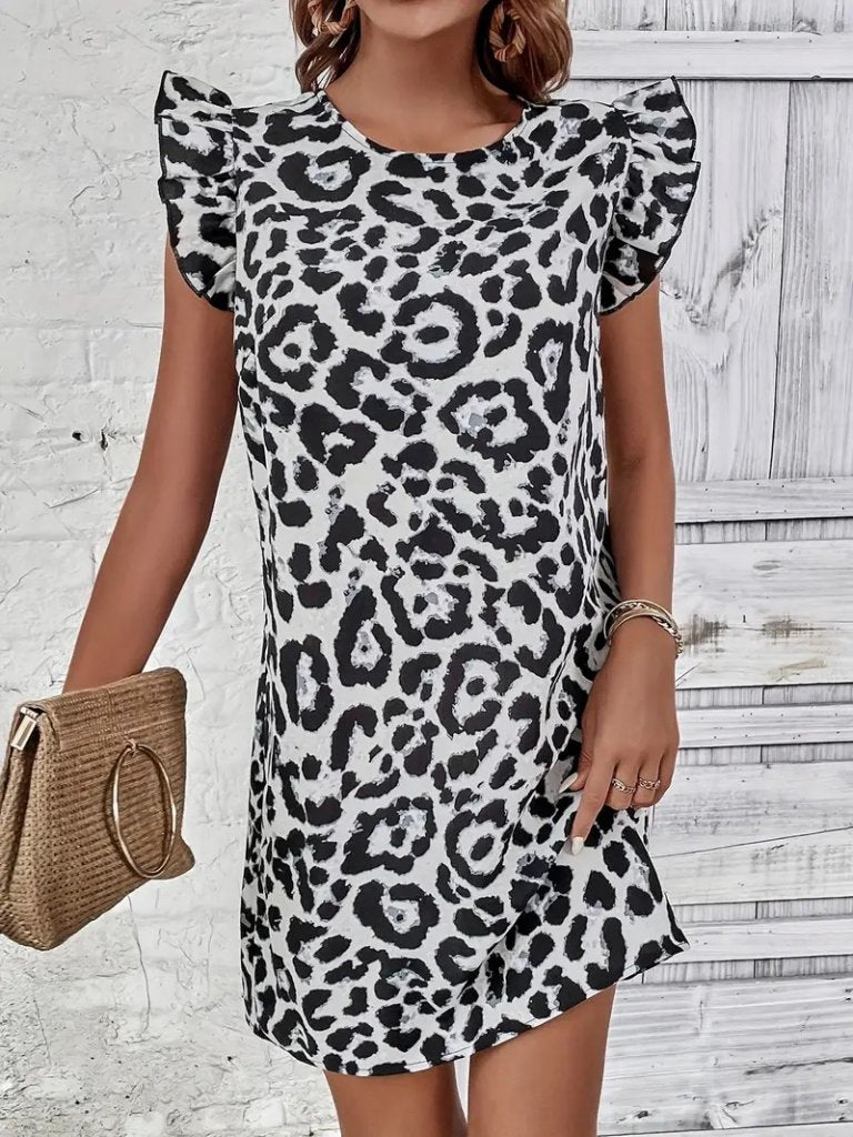 Kadın Kısa Kollu Kolları Fırfır Detay Arkası Bağlamalı Leopar Desen Kolsuz Mini Mikro Elbise