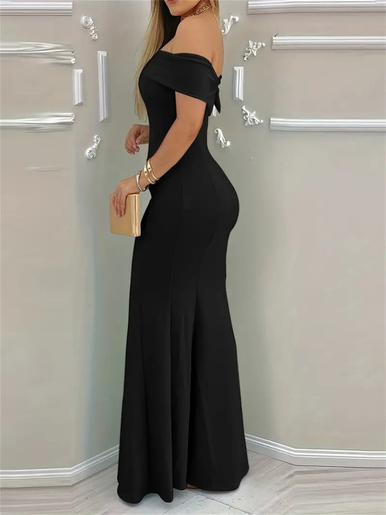 Kadın Kısa Kollu Madonna Yaka Belden Oturtmalı Uzun Ithal Krep Elbise