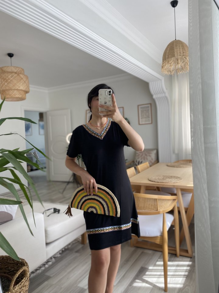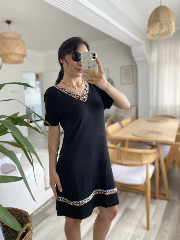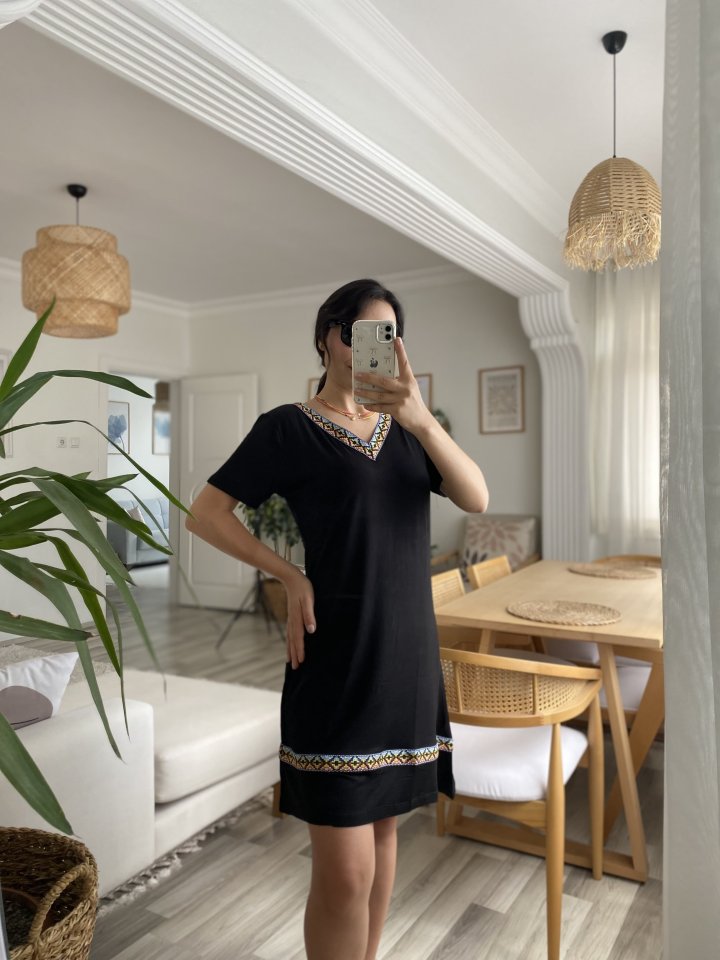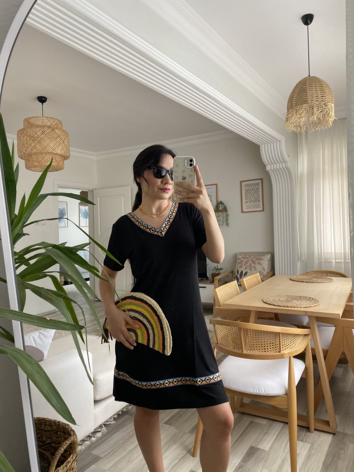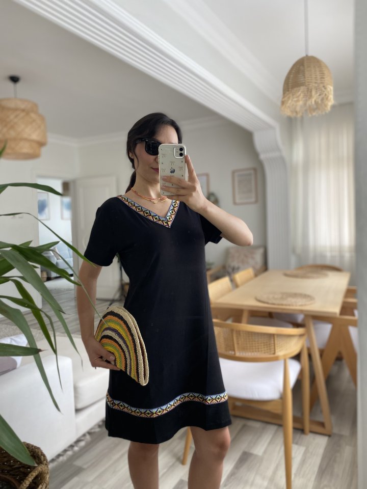 Kadın Kısa Kollu V Yakalı Etnik Desen şerit Detaylı Viskon Elbise