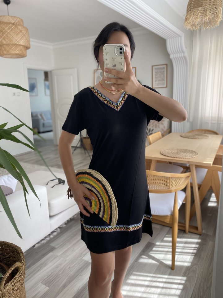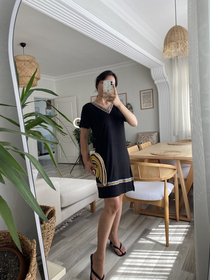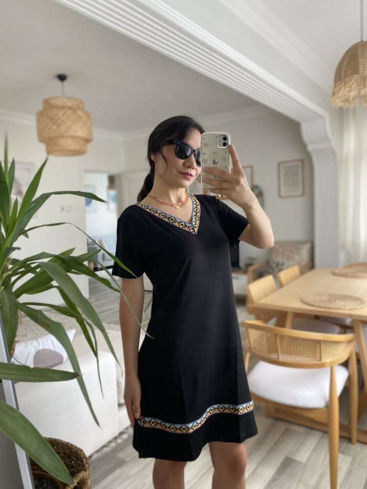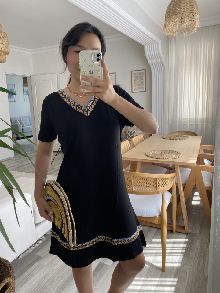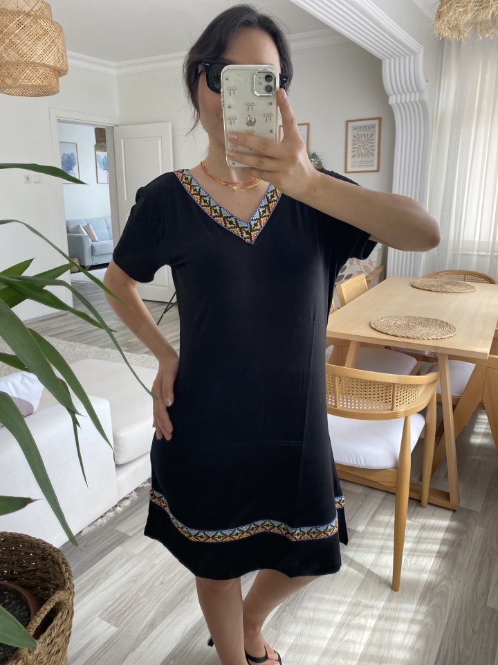 Kadın Kısa Kollu V Yakalı Etnik Desen şerit Detaylı Viskon Elbise