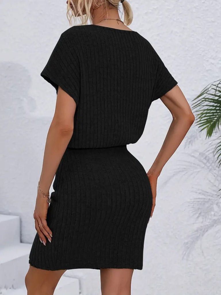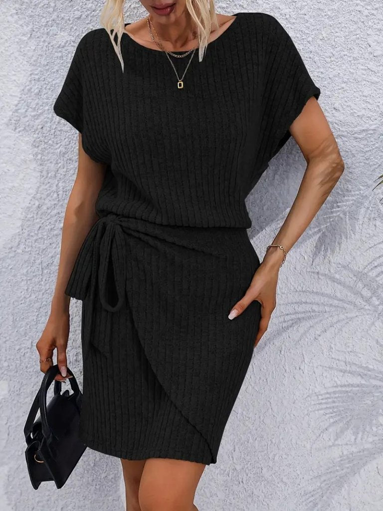 Kadın Kısa Kollu Yakası Açık Belden Lastikli Yandan Bağlamalı Kalın Fitilli Kaşkorse Elbise