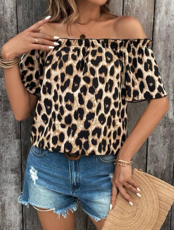 Kadın Madonna Yaka Fırfırlı Leopar Desenli Mikro Kumaş Bluz