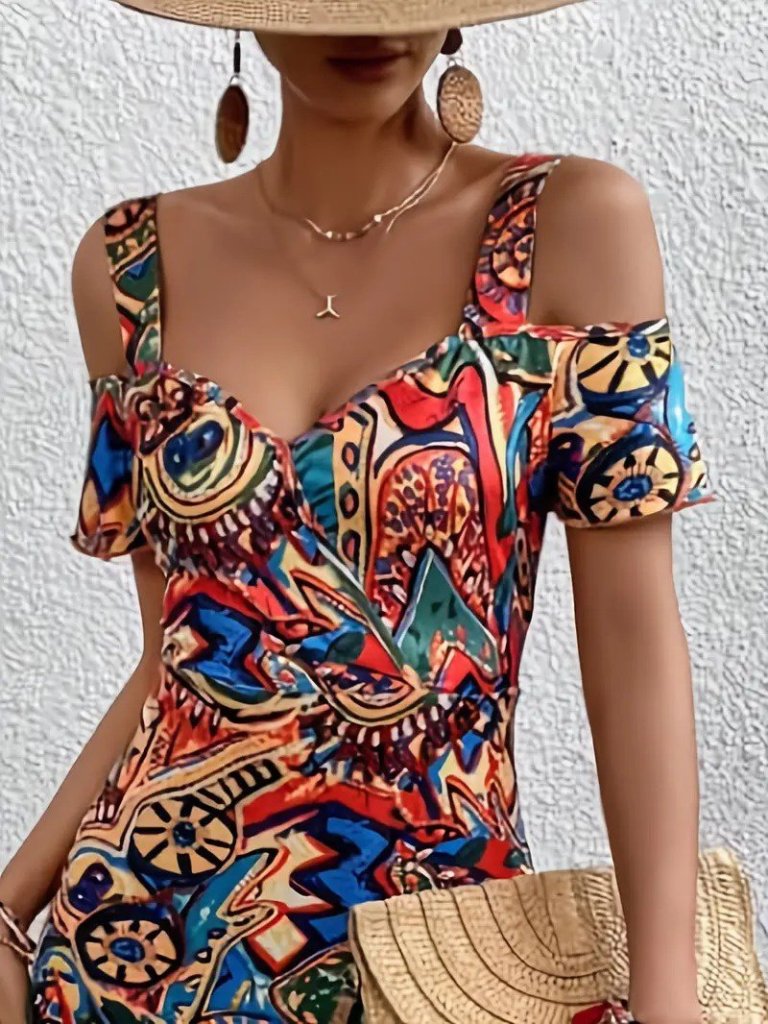 Kadın Omuzlardan Açıl Askılı Desenli Süprem Elbise