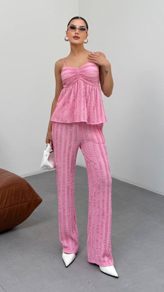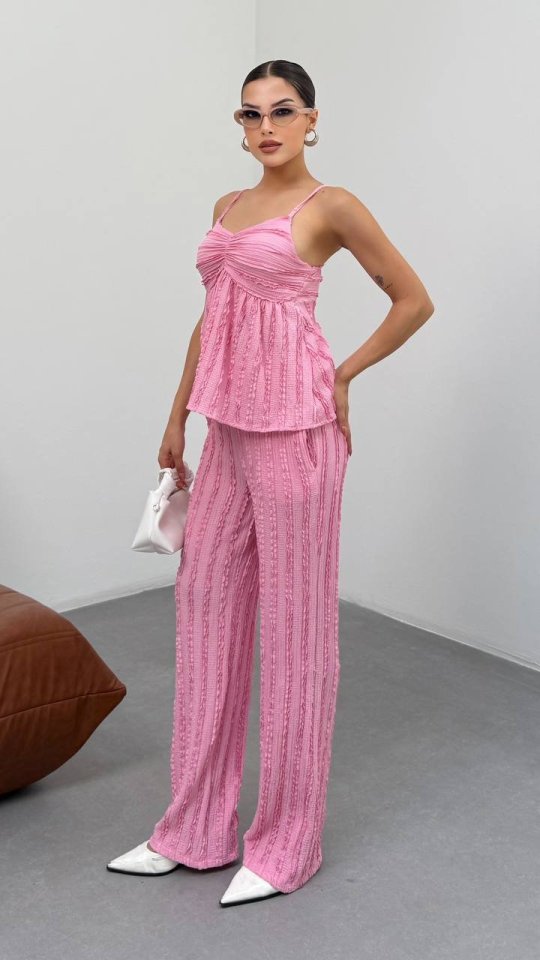 Kadın Pembe Dokulu Askılı Üst Ve Bol Paça Pantolon 2’li Takım