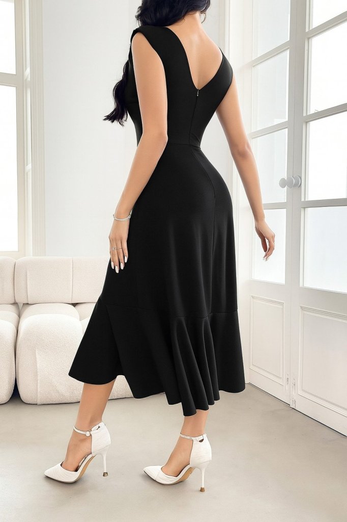 Kadın Sıfır Kollu Belden Büzgülü Eteği Volanlı Asimetrik Kesim Midi Janjan Krep Elbise