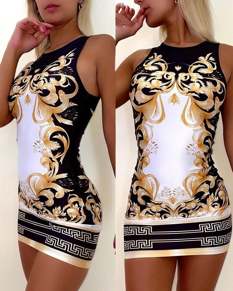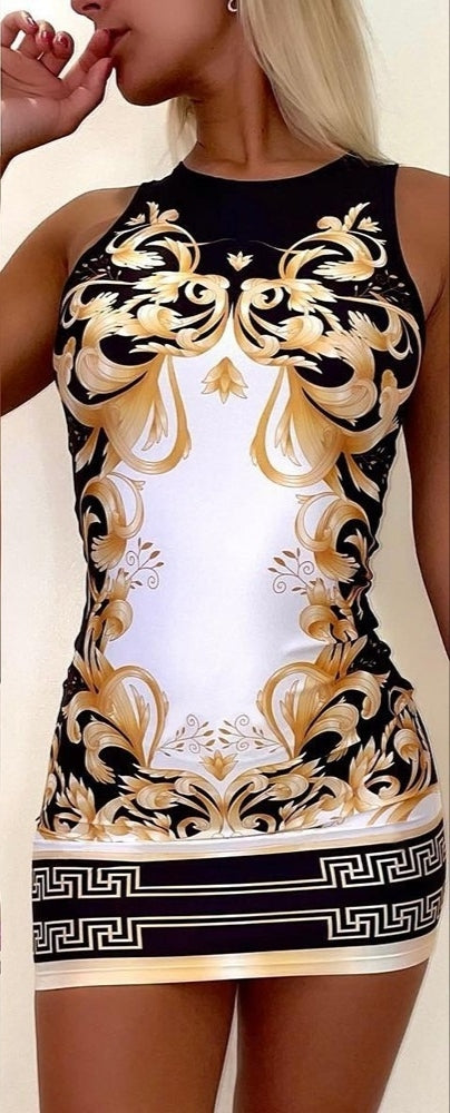 Kadın Sıfır Kollu Bisiklet Yaka Dijital Baskı Dalgıç Mini Elbise