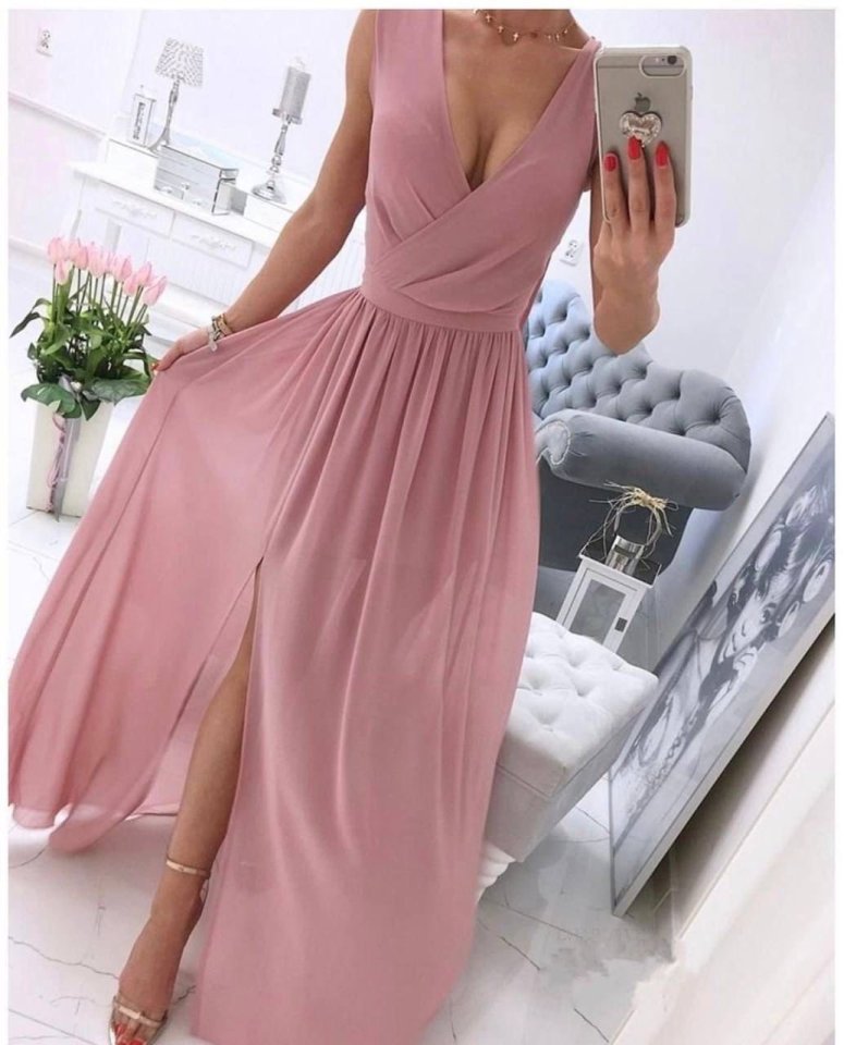 Kadın şifon Kumaş V Yaka Sıfır Kol Maxi Boy Elbise