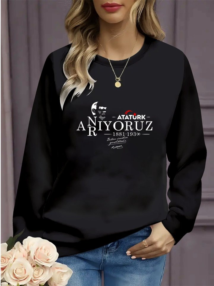 Kadın Uzun Kollu 10 Kasım Atatürkü Anma Gününe Özel Viskon İki İplik Kumaş Sweat