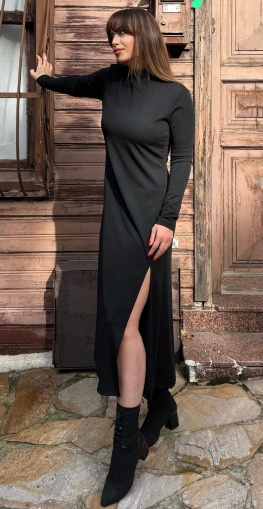 Kadın Uzun Kollu Balıkçı Yaka Derin Yırtmaç Detay Krep Elbise