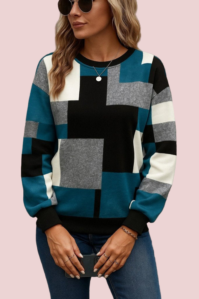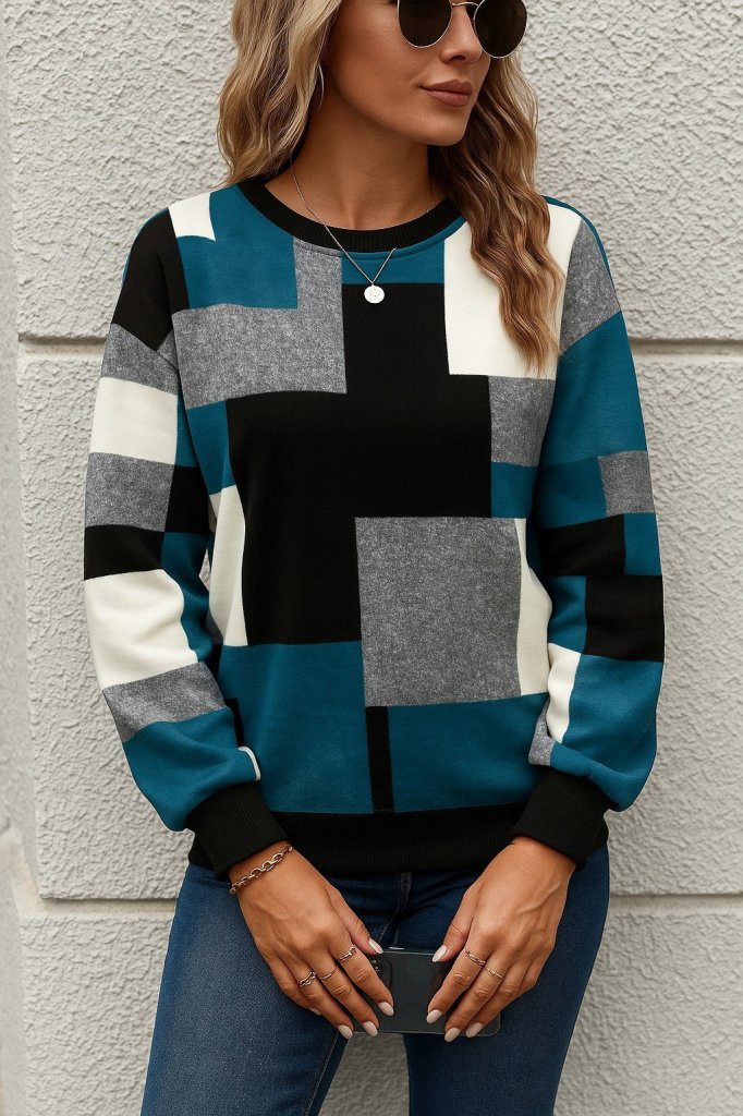 Kadın Uzun Kollu Bisiklet Yaka Renkli Blok Baskı Dalgıç Bluz