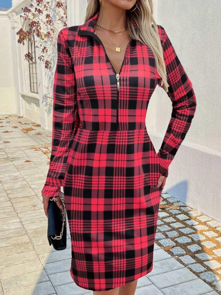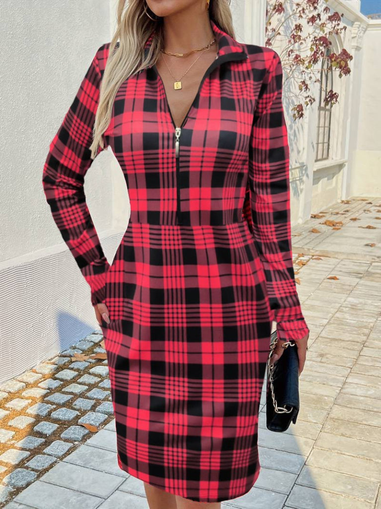 Kadın Uzun Kollu Fermuarlı Ekose Baskılı Dalgıç Elbise