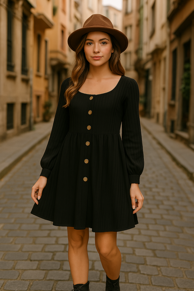 Kadın Uzun Kollu Kare Yaka önden Düğmeli Midi şardonlu Kaşkorse Elbise