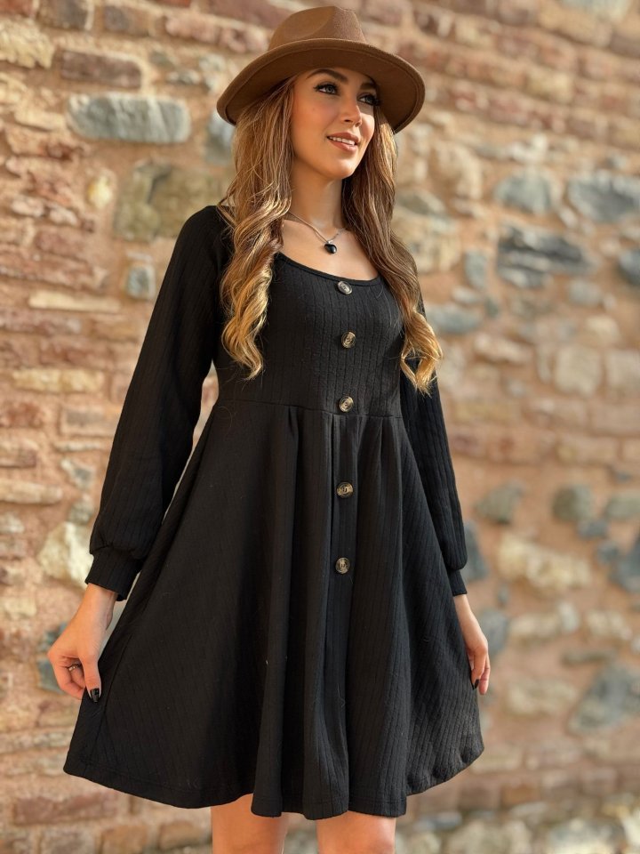 Kadın Uzun Kollu Kare Yaka önden Düğmeli Midi şardonlu Kaşkorse Elbise