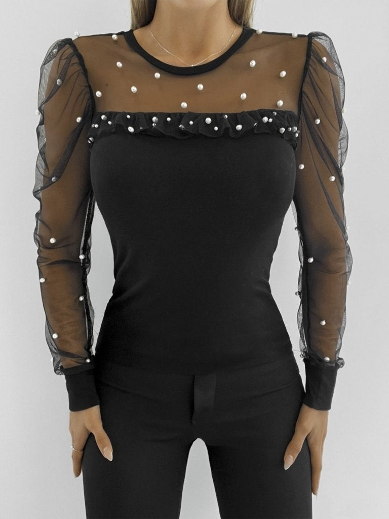 Kadın Uzun Kollu Kol Ve Yaka Tül Ve Inci Detay Viskon Bluz