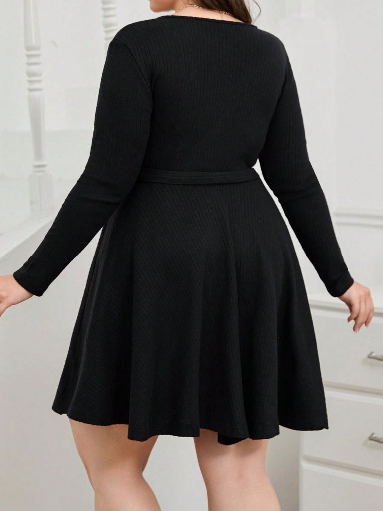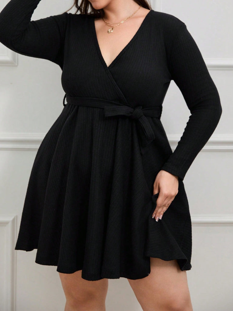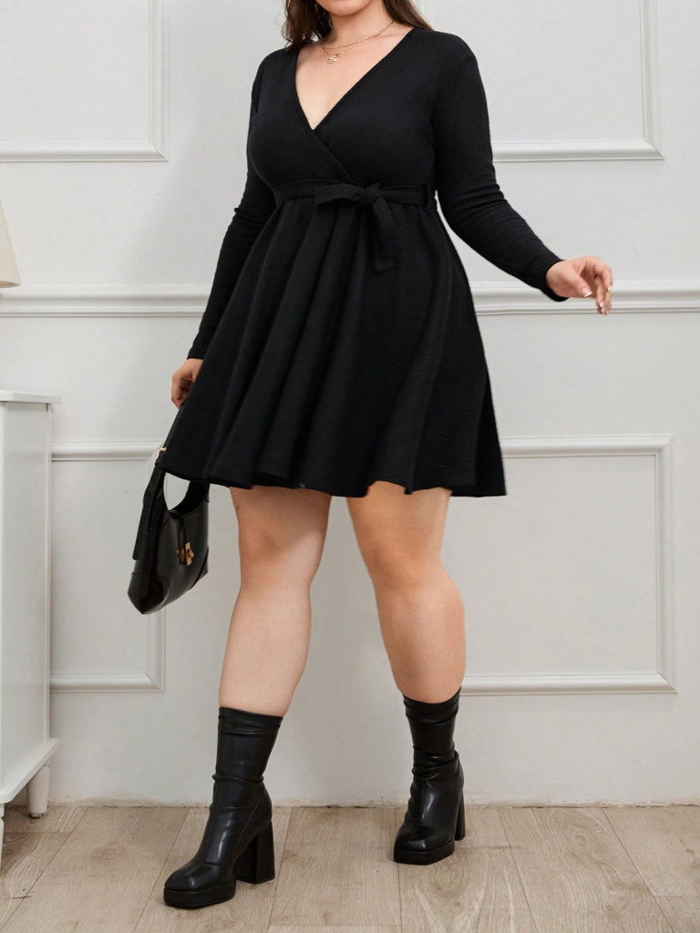 Kadın Uzun Kollu Kruvaze Yaka Kuşak Detay Salaş şardonlu Kaşkorse Mini Elbise