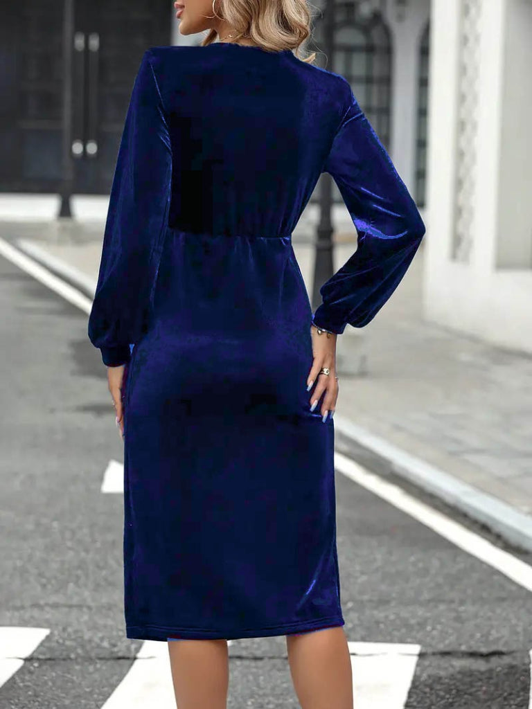 Kadın Uzun Kollu Kruvaze Yaka Yanlardan Büzgü Detaylı Yırtmaçlı Kadife Elbise