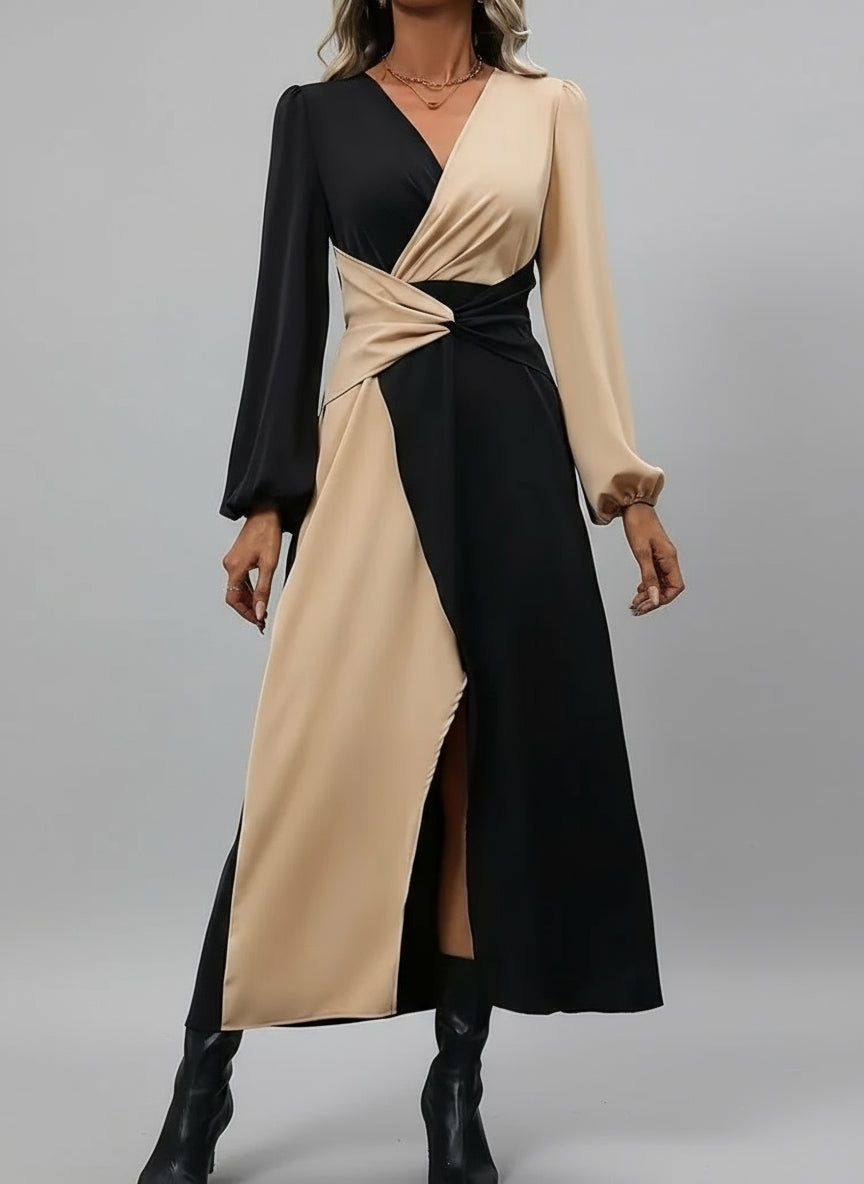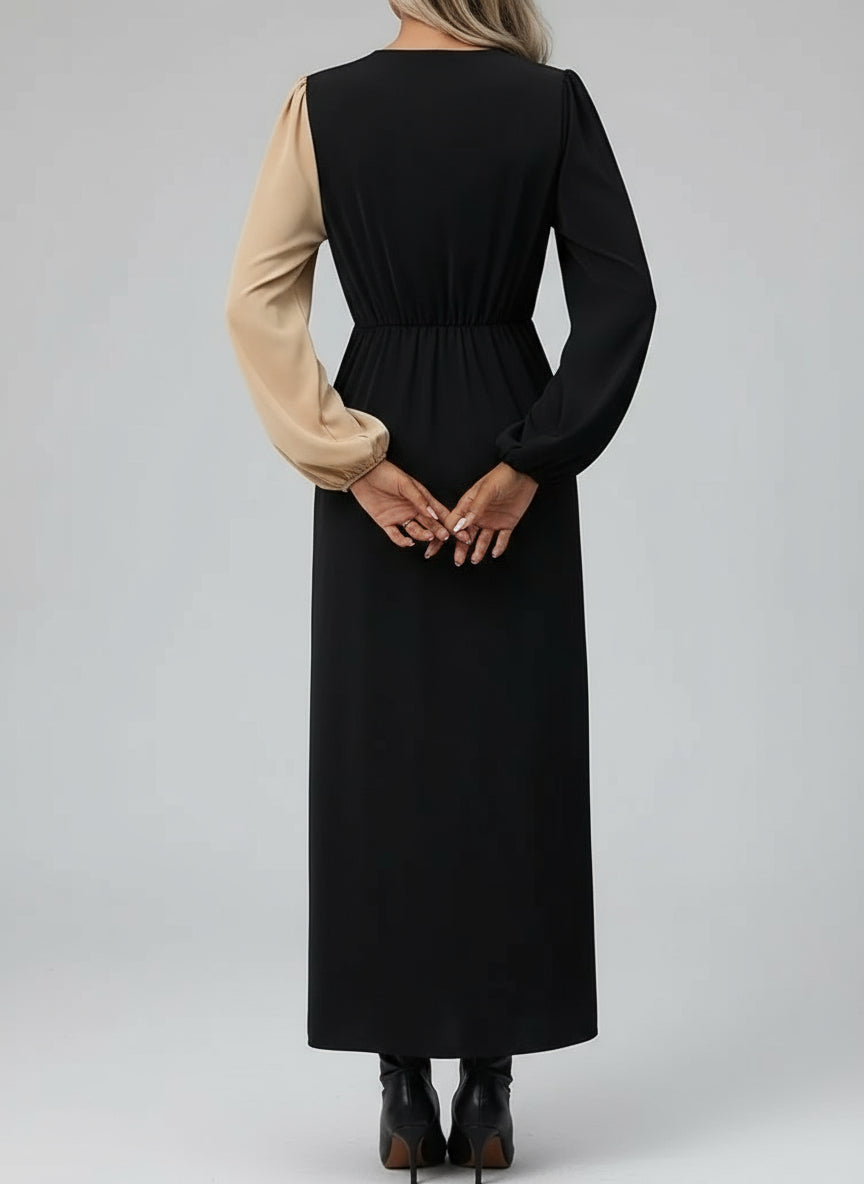 Kadın Uzun Kollu Kruvaze Yakalı Belden çapraz Detaylı çift Renkli Midi Ithal Krep Elbise