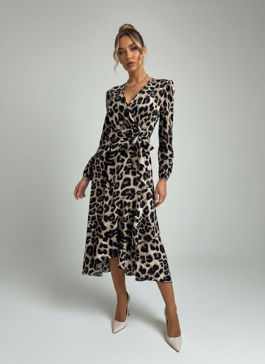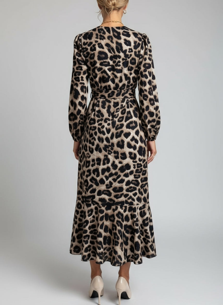 Kadın Uzun Kollu Kruvaze Yakalı Belden Kuşaklı Leopar