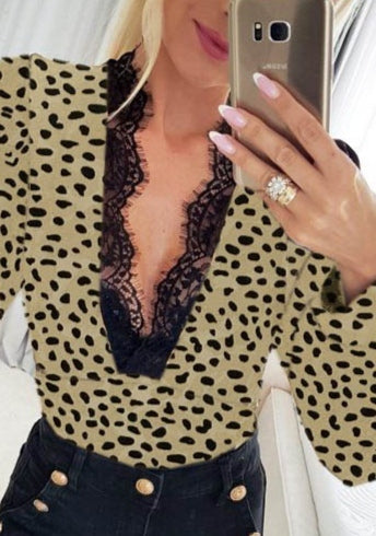 Kadın Uzun Kollu önden Derin Dantel Yaka Leopar Desenli Dalgıç Bluz