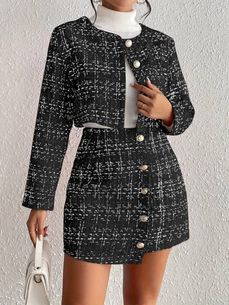Kadın Uzun Kollu önü Düğmeli şanel Ceket Ve Etek Takım