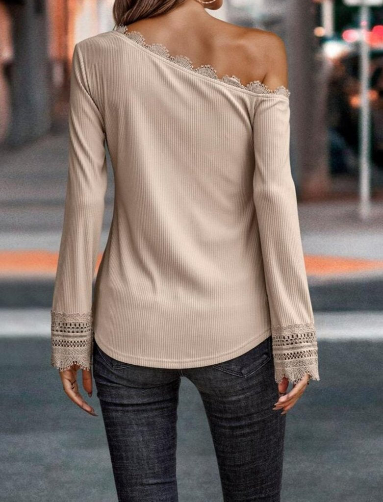 Kadın Uzun Kollu Tek Omuzu Açık Dantelli Burgu Bluz