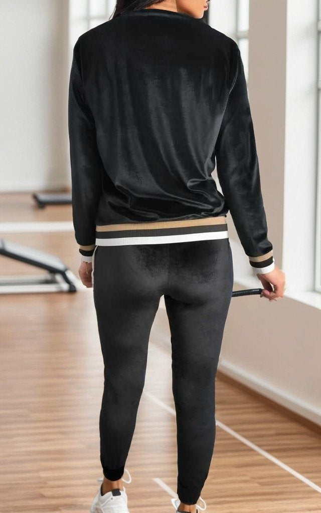 Kadın Uzun Kollu V Yaka Yakası Ve Kol Ağzı şerit Detay Armalı Kadife Takım