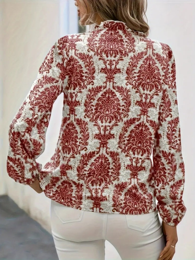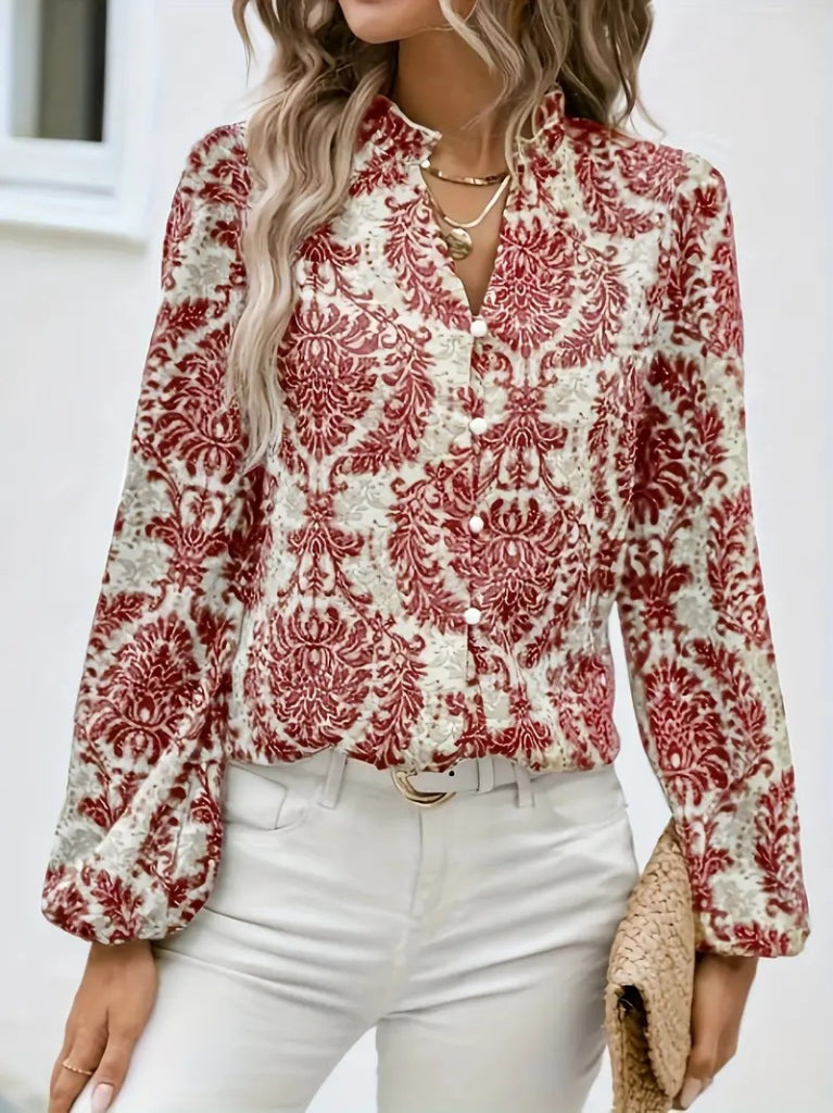 Kadın Uzun Kollu V Yakalı Desenli önü Düğmeli Ithal Keten Bluz