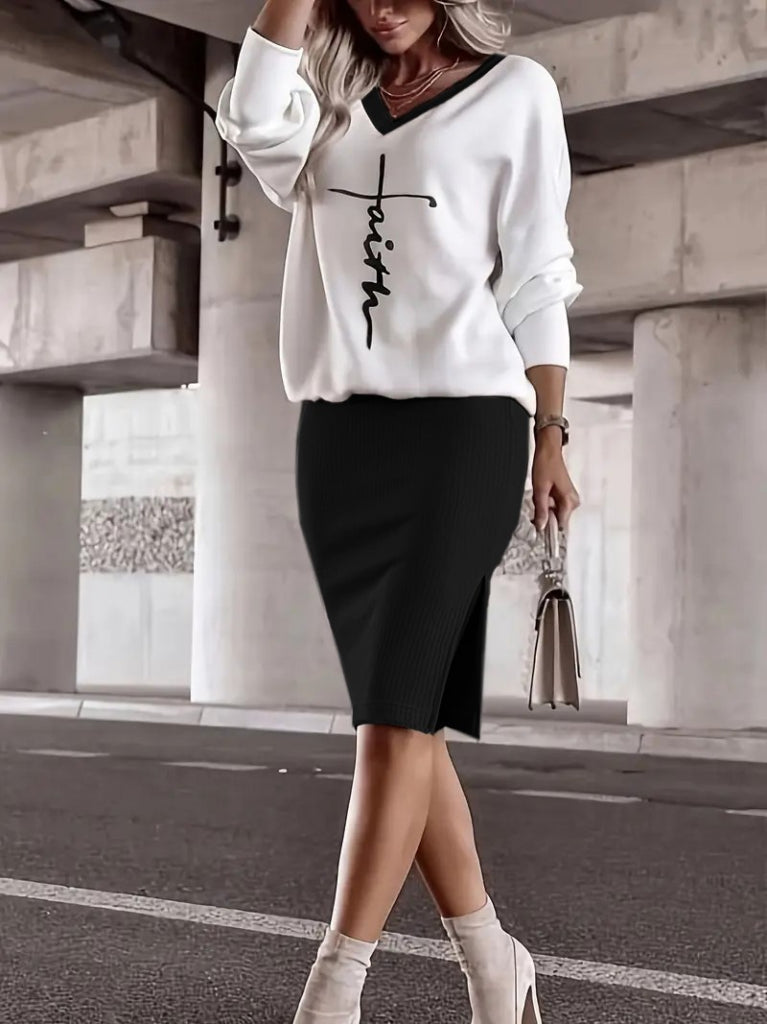 Kadın Uzun Kollu V Yakalı Iki Iplik Bluz Ve şardonlu Kaşkorse Etek Ikili Takım