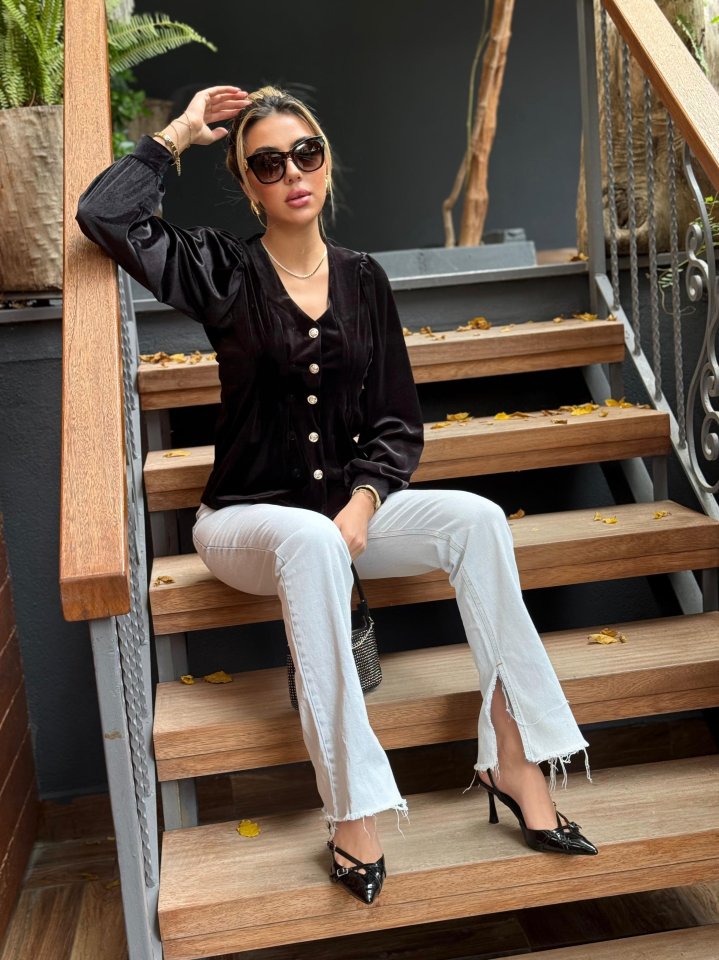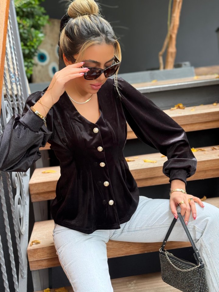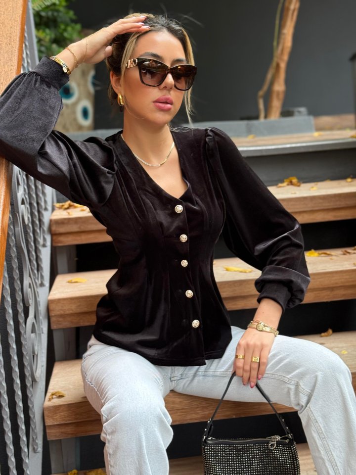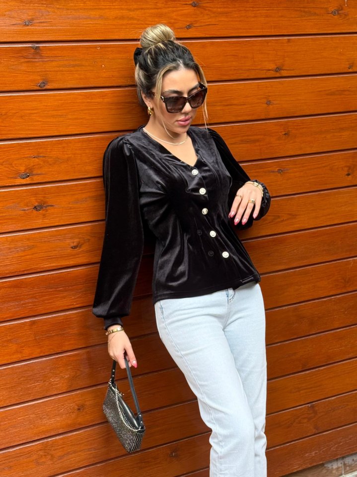 Kadın Uzun Kollu V Yakalı önden Düğmeli Kısa Kadife Bluz