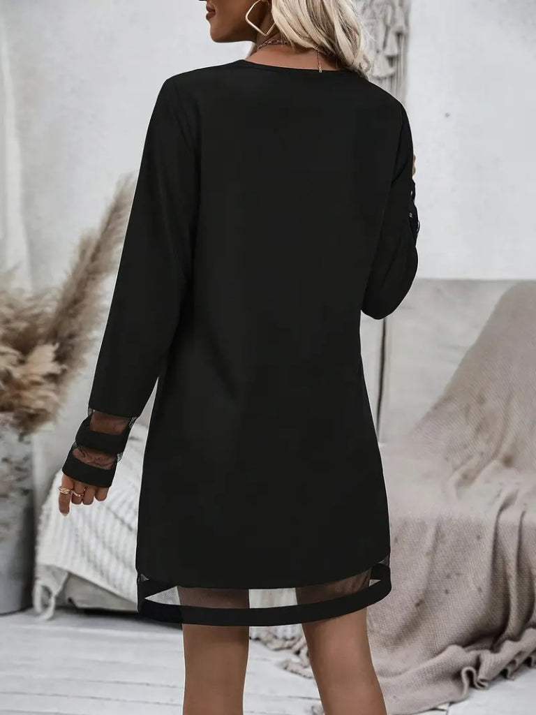 Kadın Uzun Kollu V Yakalı şeritli Tül Detaylı Ithal Krep Elbise